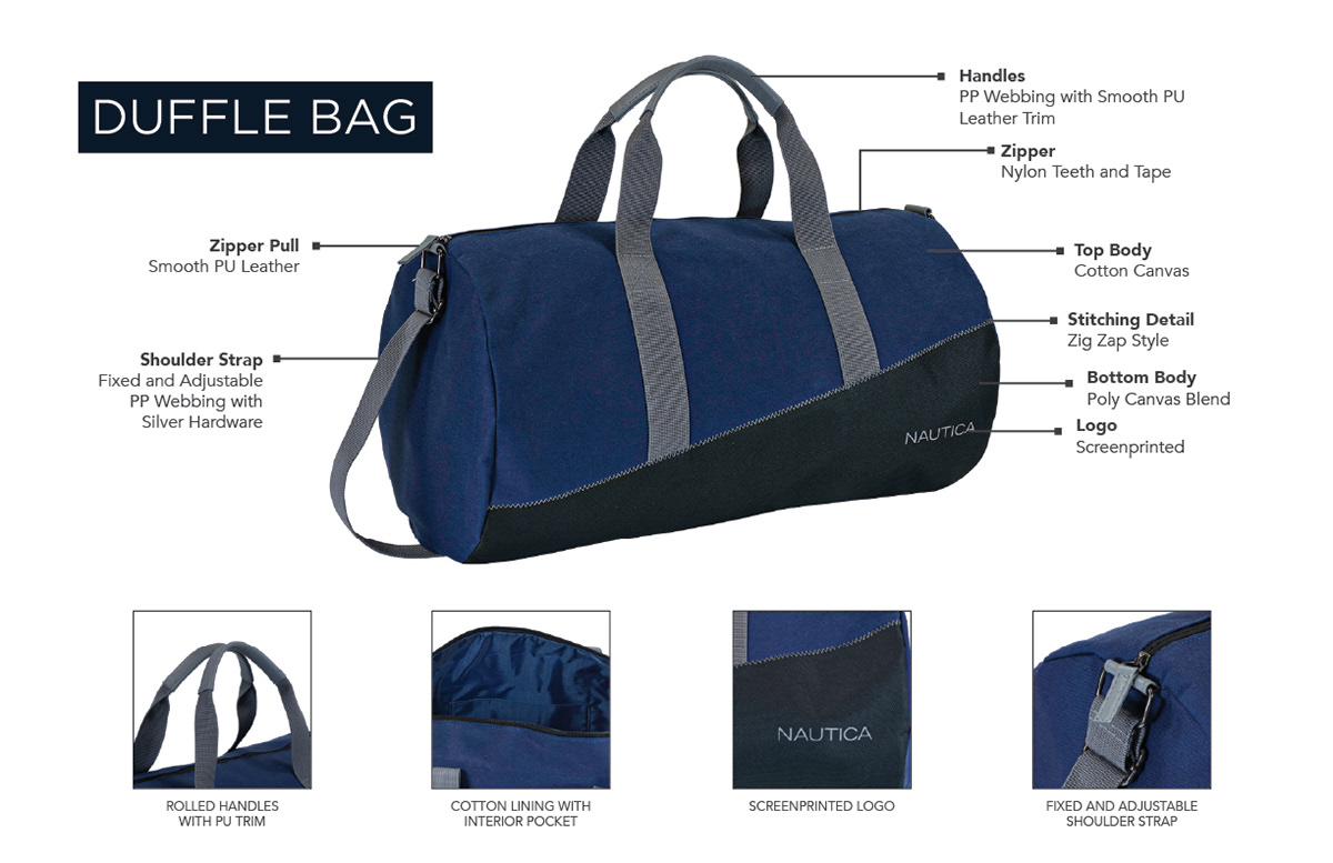 Nautica's fragrance division wanted us to develop a Duffle Bag that would have commercial appeal, was in-line with Nautica Fashion House positioning, and had presence on counter for the Fall 2018 Season.